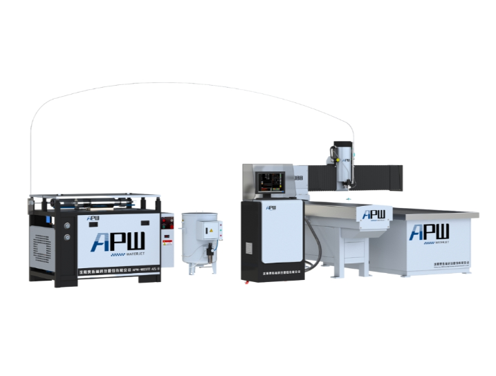 超高压数控水射流加工设备又称“水刀”,通过水射流增压缸可以将水压从1个大气压增加到300 MPa以上。宝石喷嘴喷出的高速水射流可以轻松切割橡胶、皮革、塑料等。在水射流中加入沙子后,可以切割石头、玻璃、陶瓷、钢板等。在数控系统的驱动下,它可以切割任何形状的板材。
