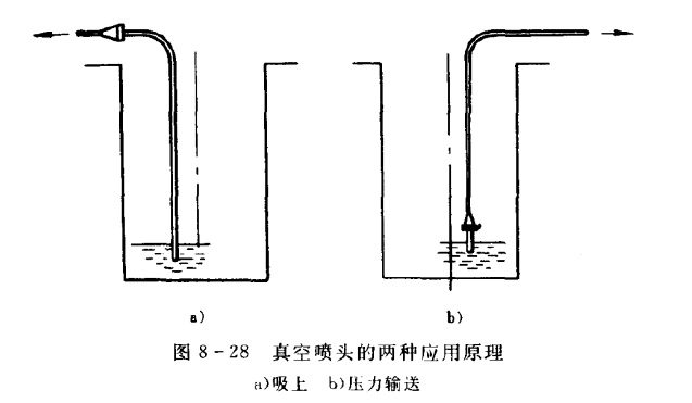 在流速达300m/s的喷嘴出口处连接一真空喷管,便可达到按照相应真空泵性能所产生真空的95%。 这里的喷嘴布置 以汇聚式磨料射流的水喷嘴排列,即呈环形布置,射流汇聚点即喷管的文丘里段与直管段的结合部位。 这种真空喷头按吸人管径分为50mm、75mm、100mm三种。真空喷头有吸上和压力真空引射两种不同的应用原理(见图8 - 28)。喷嘴出口在地平面以上,喷头的吸上性能可与真空泵相比。 如果吸入管内能获得100%的真空,理论上对密度为lt/m3 的介质(如水)能够吸上达10m的高度。 吸上高度取决于被输送介质的密度和黏度。 对低黏度介质,吸上高度可达7~8m;对高黏度 3. 介质,需在吸入端加水稀释。 吸上应用不适用于浆料、堵塞物等。