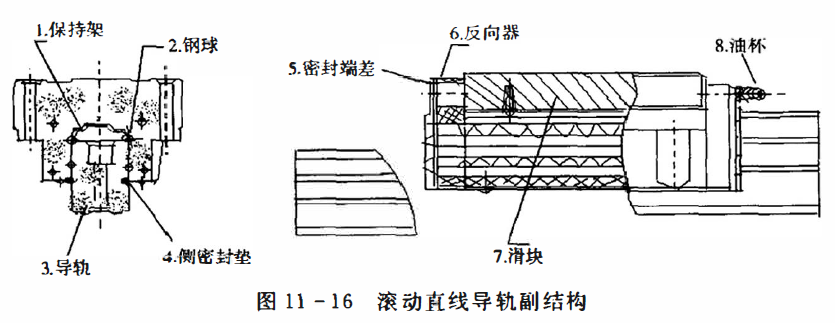 滚动直线导轨副结构由导轨、滑块、钢球、反向器、保持架、密封端盖及挡板等组成(见图11 -16)。 当导轨与滑块相对运动时,钢球就沿着导轨上的经过悴硬和精密磨削加工而成的4道滚道滚动,在滑块端部钢球又通过返向装置(反向器)进入反向孔后再进人滚道。 钢球就这样周而复始地进行滚动运动。 反向器两端装有防尘密封端盖,可以有 效地防止灰尘、屑末进入滑块内部。