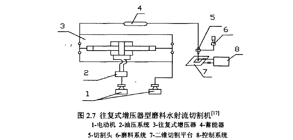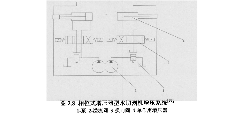 第二种是目前国外采用较多,国内普遍采用的往复式增压器方式,其系统构成如图2.7所示。主要由油压系统、供水系统、往复式增压器系统、以蓄能器为核心的恒压系统、喷嘴和管路等组成。其特点是油压系统采用现有的液压技术和元件就能解决,往复式增压器及蓄能器用户可以自己开发研制、加工制造并非十分复杂。但往复式增压器两个高压腔中的压力相位始终相差180度,排水和吸水动作是不连续的,产生的压力存在波动。