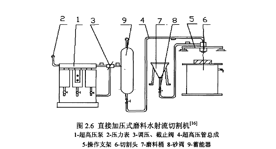 第一种是采用往复式三柱塞泵直接将水加压到高压或超高压,如图2.6所示,它被称为直接加压式,该结构省去了油压系统,结构简单、工作可靠、维护方便,水压脉动较小,但其往复式三柱塞泵的结构复杂、精度高、价格昂贵,一般用户不能自己生产,目前主要在高校、研究院所的试验装置中有所应用。