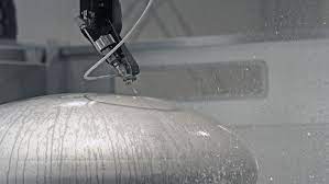 工件定位、装夹完成后,数控三维水切割由程序控制按扇形反射面的三维曲线路径精确切割边缘轮廓线、窗口和打孔,使工件和废料分离,所有加工一次完成。切割超大型天线的扇形反射面蒙皮时可配备两个机械手臂从不同方向同时切割以提高工作效率。