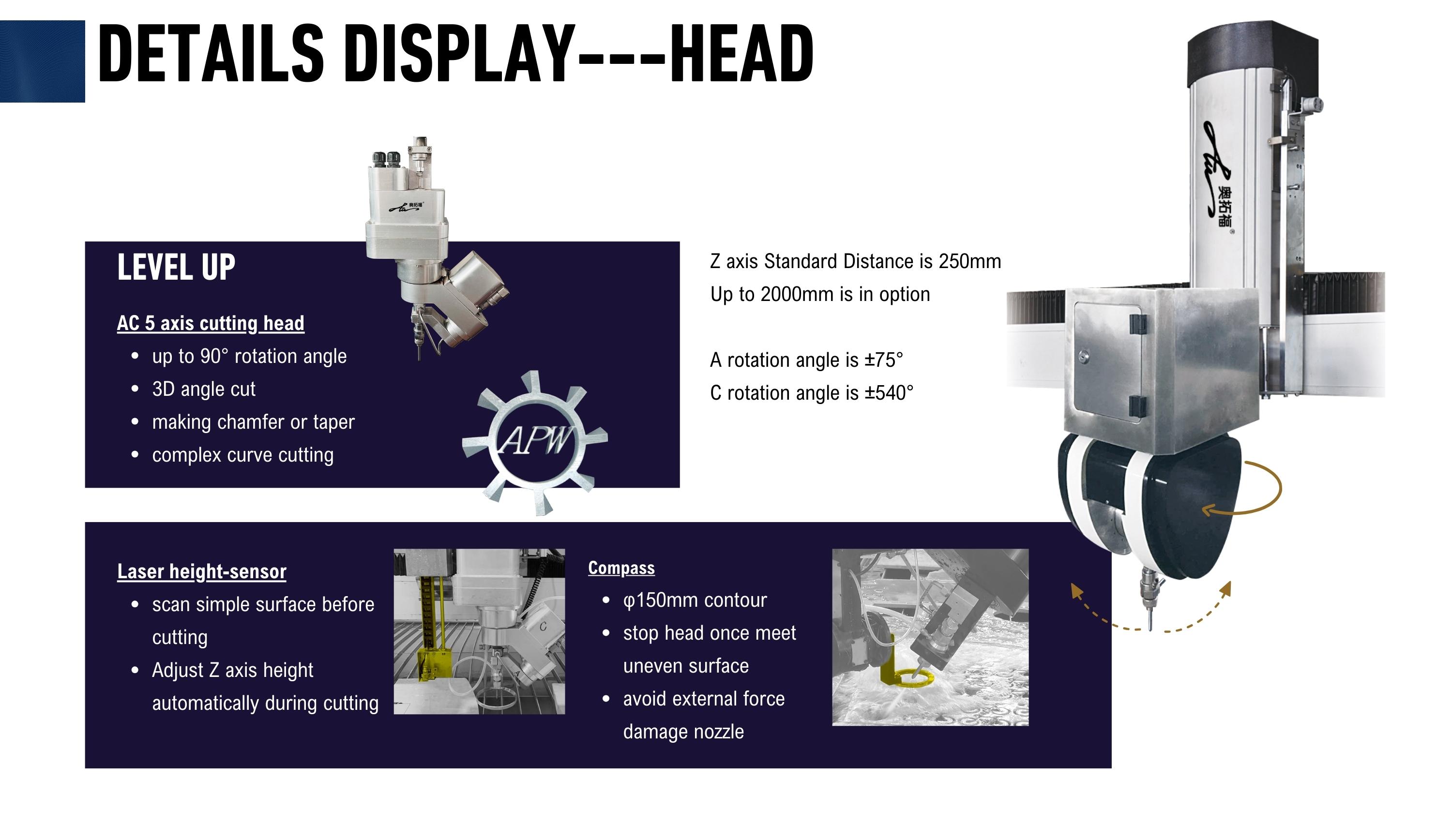 2、ACWZ-JET 大角度锥度切割刀头:大角度5轴切割使用,适合复杂形状和三维切割任务,支持大角度锥度切割,适用于航空航天、汽车制造等高精度加工场景。