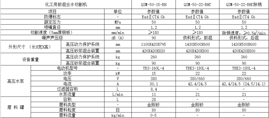 QSM-50-15-BH型化工用前混合水切割机,适用于化工储罐、石化管道、圆柱类金属的切割和化工厂拆除维修、打孔切口、清洗除锈等。是在化工企业易燃易爆环境实施切割作业的安全设备。本机型可切割厚度0.1- 100mm的任何材质(金刚石及特种硬质合金除外)。