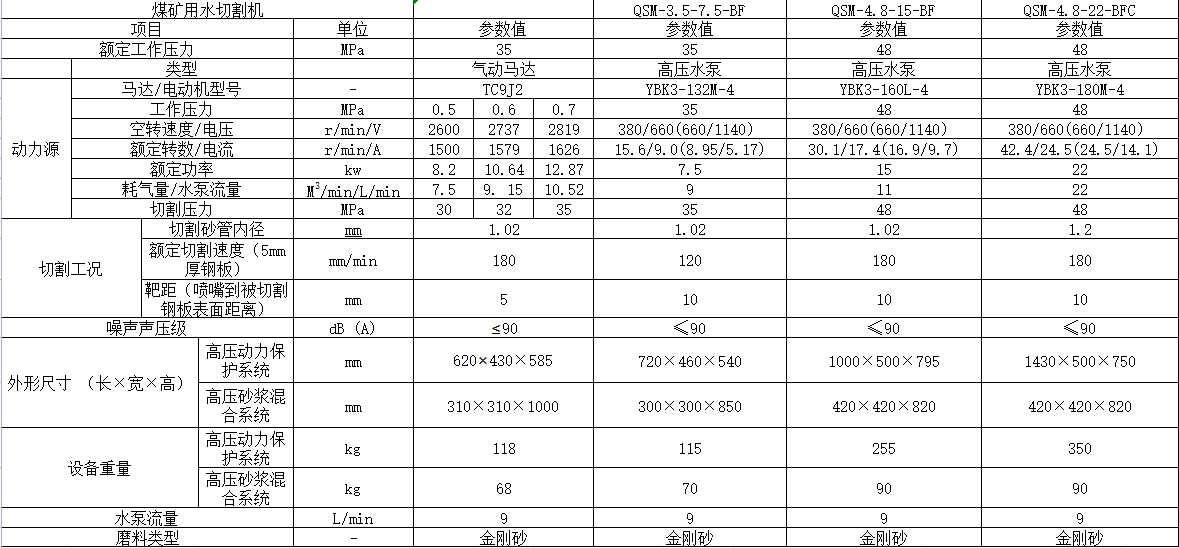 QSM-3. 5-Q-BF、QSM-4-Q-BF气动水切割机,采用井下气源作为动力驱动增压进行切割,体积小,易于人工搬运,适用于煤矿井下拆除、维修过程中的切割作业,是在煤矿井下易燃易爆环境实施切割作业的安全设备。本机型可切割厚度 0.1 -100mm的任何材质(金刚石及特种硬质合金除外),例如锚索锚杆、U型钢、槽钢、工字钢、轨道钢、角钢、钢板、钢管等。