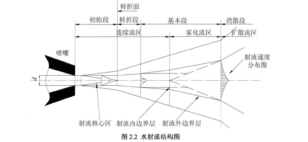 磨料水射流经由喷嘴射出进入空气中分为四个阶段:初始射流核心区、射流速度稍减且些许扩散的转折段、射流速度逐步减小的基本段以及与空气等融合的消散段。