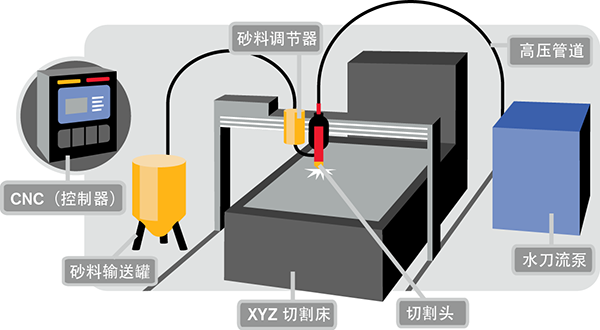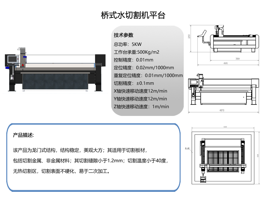 MORE+水刀数控切割平台是水切割机中极其重要的组成部分。它主要由X轴、Y轴、Z轴传动部分,水箱部份,切割部分,润滑部分及数控拖动部分等组成。