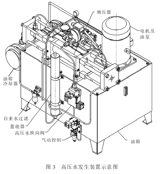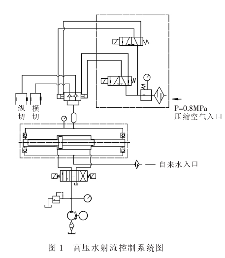 高压水射流控制系统流程为:油泵加压、电磁换向阀、高压水增压器、高压蓄能器、高压水换向阀、高压水喷嘴、板材切割。