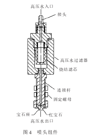 由于喷嘴的出水口径通常都很小,在日常使用过程中高压水通过喷嘴时不免有自来水的杂质以及设备在运转过程中的磨损物质将喷嘴堵死,严重影响设备的正常运转,经常需要停止设备进行检修。在喷嘴的前部设置高压水过滤器,结构如喷头组件(图4)所示,能有效的解决喷嘴容易堵死的问题。
