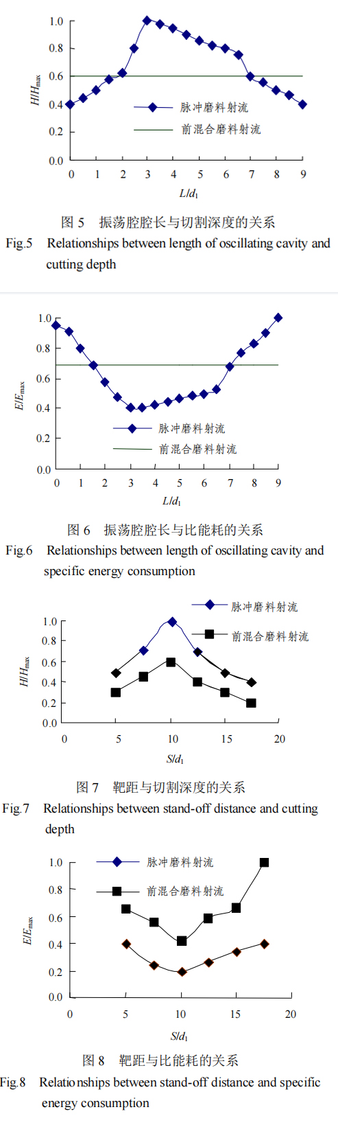 从图 5,6 中可知 脉冲磨料水射流的最大切割深度是前混合式磨料水射流 的 1.72 倍(L/d1=3 时) 当 1.5 L/ d1 7 时,形成强烈的自激振荡,磨料向射流中心聚集从而获得良好的脉动加速,能量传输效率得到较大提高,从而使得脉冲磨料水射流切割深度增大,比能耗降低。