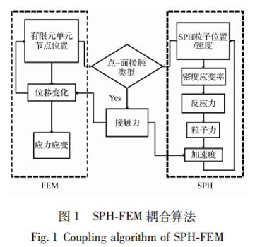 SPH粒子在 LS-DYNA中被视为特殊节点单元,控制参数为节点编号、质量及空间位置。SPH粒子与FEM耦合通过罚函数方式将质点力作用于有限元单元表面,因此 SPHFEM耦合采用 NODE_TO_SURFACE点面接触方式。本文 SPH与 FEM耦合处理中,将 SPH粒子定义为从节点,与 SPH粒子接触界面的有限元单元表面定义为主面。接触耦合算法见图 1[21]。
