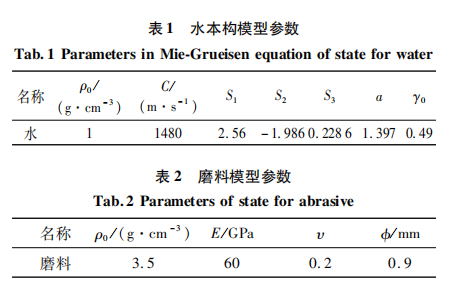 水采用 SPH算法建模,在 LS-DYNA中用 NULL材料模型,并对水材料模型赋予 Mie-Grueisen状态方程;磨料粒子为陶粒,采用 lagrange有限元建模,并用刚体材料模型,直径均为 0.9mm(对应20目)。建模过程中为尽可能接近实际工况,建立密集的 SPH水粒子束,将磨料粒子分布于水粒子中;为防止水粒子对磨料粒子初始穿透,将每颗磨料粒子位置的SPH水粒子逐一删除,以“挖”出磨料粒子的存在空间。水与磨料模型参数分别见表 1、表 2,其中 ρ0为材料密度;E为弹性模量;υ为泊松比;∅为直径。Mie-Grueisen状态方程为