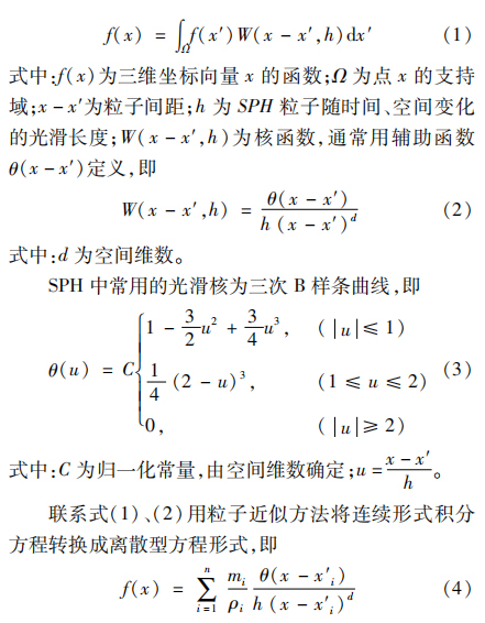 磨料水射流作为新型特种加工技术,将磨料与高速流水或高压水互相混合形成液固两相介质射流[1-3]。据射流混合方式不同,磨料水射流可分为前、后混合式磨料水射流[4]。前者因能使磨料与高速流水充分紊动混合,较后者切割、破碎效率更高。磨料粒子的加速效率为决定磨料射流破碎结构体效果的主要原因,因此研究前混合式磨料射流中磨料粒子加速过程,对提高水介质对磨料的加速效率,优化喷嘴结构具有重要意义。 前混合式磨料水射流磨料在喷嘴内运动复杂,实验研究需在尺寸较小的喷嘴内测量超高速射流运动、磨料粒子运动轨迹及两者间混合时相互作用现象极其复杂、困难,但随计算机技术、理论发展,可用数值模拟计算手段对该问题分析研究。Kumar等[5-8]用非线性有限元 方 法 模 拟 磨 料 粒 子 破 碎 结 构 体 过 程;Wang等[9-11]用 SPH算法模拟水射流破岩过程;司鹄等[12]用ALE流 -固耦合罚函数算法模拟磨料水射流破煤岩过程。以上研究仅局限于喷嘴外射流模拟,侧重点是靶体受作用后的力学分析,且对磨料、水均赋予相同初速度,两者间无直接能量传递。Nguyen等[13-17]对两相流在喷嘴内、外流场数值模拟,获得较好模拟结果,且在一定程度上可获得磨料粒子的运动情况。王建明等[18]基于 SPH与 FEM耦合法模拟磨料水射流中单磨粒加速过程,但仅针对后混合磨料射流中单颗粒磨料在水刀直线加速段的加速过程进行模拟。 本文采用 SPH与 FEM耦合算法,将前混合磨料水射流的形成过程考虑成柱塞以一定运动速度作用于水,使水以一定流量向前运动,带动事先随机分布于水中的磨料,通过收缩喷嘴形成高速磨料水射流。重点研究磨料粒子在喷嘴内部及距出口一定范围内的加速过程,分析喷嘴结构对磨料粒子加速效果影响规律。1 SPH方法相关理论 磨料水射流形成过程中高速流动的水涉及大变形问题,采用传统拉格朗日法模拟会出现网格畸变导致计算终止。SPH法不用单元而用固定质量的可动点,无网格畸变。磨料粒子用 FEM模拟,利用有限元计算精度高的特点能准确获得加速过程中运动特性。因此,SPH与FEM耦合算法既可较好模拟磨料水射流的形成过程,又能准确获得磨料粒子在喷嘴不同阶段的加速特性。1.1 SPH基本理论 SPH方法基础为插值理论[19-20]。在 SPH中任一宏观变量均能方便借助一组无序点值表示成积分插值计算获得。核近似函数为