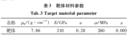 靶体为钢材料采用 lagrange有限元建模,选用PLASTIC_KINEMATIC材料模型,该材料模型按照单元的应变值是否超过材料失效应变值确定是否删除单元,可在一定程度上模拟靶体受磨料水射流作用后冲蚀孔的发展过程。材料参数见表 3,其中 ρ0 为材料密度;E为弹性模量;υ为泊松比;σ为失效应力;ε为失效应变。
