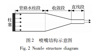 将前混合磨料水射流形成过程考虑为柱塞以一定速度作用于水,使水以一定流量向前运动,带动事先随机分布于水中的磨料,通过收缩喷嘴形成高速磨料水射流。喷嘴、柱塞均采用 lagrange有限元建模,采用刚体材料模型,其结构示意图见图 2。