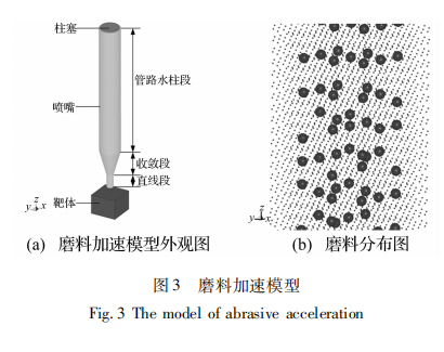 据建模方法进行两次模拟计算,即侧重于磨料水射流形成后对靶体作用及将模型中靶体删除并着重分析研究磨料粒子在喷嘴不同阶段加速过程。