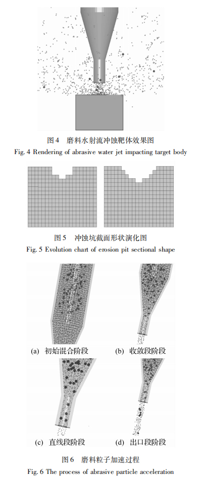 流量 74L/min的高压水携带磨料粒子群经喷嘴形成高速磨料水射流作用于靶体后效果图及冲蚀坑截面形状演化图见图 4、图 5,该流量高压水携带磨料粒子群在喷嘴收敛段、直线段及出口段运动全过程见图 6。