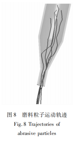 为获得磨料粒子在喷嘴中的运动形态,选5颗粒子追踪其在喷嘴中的运动轨迹,见图8。由图8看出,磨料粒子运动轨迹表明其在收敛段的运动较剧烈,因过流断面变窄,其与喷嘴壁面及磨料粒子之间均存在碰撞;进入直线段后因滞留时间较短,磨料粒子彼此之间碰撞机会变小,运 动 相 对 收 敛 段平缓。