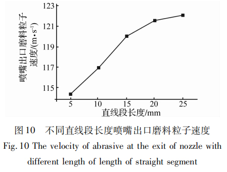 流量一定即74L/min,喷嘴进出口直径一定即14mm、3mm,喷嘴收敛段长度 20mm情况下,改变直线段长度,选4颗磨料粒子获得喷嘴出口(直线段末端)平均速度,见图10。由于收敛段中磨料粒子已与水存在速度差,且直线段中水仍有加速,故直线段加长会致磨料粒子加速空间更长。由图10看出,随直线段加长磨料粒子在喷嘴出口速度增大,但随直线段长度逐渐增大,磨料粒子速度增加幅度逐渐变小,直线段长度由5mm到15mm,速度增加较大,平均每增加5mm速度增大2.75m/s;直线段长度由15mm到20mm,速度增大1.5m/s;直线段长度由20mm到25mm,速度增大0.5m/s。直线段长度变化 20mm速度增加7.5m/s,增加幅度较收敛段有所增大,但当磨料粒子速度增加到与水流速度接近后,其速度增长幅度随直线段延长变小,且在实际应用中直线段过长会使水与磨料粒子的沿程阻力增大导致能耗增加,故在满足工况设计前提下,可适当延长喷嘴直线段长度,但不能过多延长。
