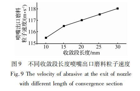 按本文模拟方法,在流量一定即 74L/min,喷嘴进出口直径一定即14mm、3mm,喷嘴直线段长度10mm下改变收敛段长度,选4颗磨料粒子获得喷嘴出口(直线段末端)平均速度,见图9。由图 9看出,喷嘴收敛段加长下由于流量一定,喷嘴进出口速度一定,水流经喷嘴收敛段的平均速度变小,由此可以推断水流经收敛段加速度变小,从而对磨料的加速较弱,但收敛段加长会延长磨料粒子的加速历程,使其有相对充裕的加速时间。随收敛段加长,磨料粒子速度呈增大趋势,收敛段长度由10mm增加到15mm,速度增加1m/s;收敛段长度由15mm到30mm每增加5mm,速度增加0.5m/s。由此,收敛段长度变化20mm 速度增加 2.5m/s,增加效果有限。
