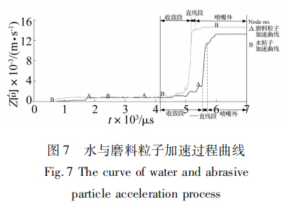 由于数值模拟中建立的磨料粒子非单独一颗,在磨料粒子的加速过程中涉及到磨料粒子间碰撞,为尽可能获得完整加速过程,在磨料粒子群即将进入喷嘴收敛段时提取其前端靠近喷嘴轴心线的一颗磨料粒子,选水介质部分中与提取的磨料粒子处于 Z轴方向同一断面上一颗 SPH水粒子,绘制喷嘴轴线上速度 -时间曲线,分别按磨料粒子、水粒子运动历程将喷嘴不同阶段标注于速度 -时间曲线上,见图 7。由图 7看出,磨料粒子进入喷嘴收敛段前已基本达到与水相同的运动速度,进入收敛段后在流量一定情况下,由于过流断面积变小,水流速度急剧增大使磨料粒子与水之间存在速度滑移,该速度差的存在使磨料粒子获得加速,但由于磨料粒子质量大,惯性大,故磨料粒子提速相对缓慢,导致在收敛段中其与水速度差逐渐增大;进入直线段后,由于收敛段积聚的压能部分释放,水流速度继续增大,但增量有限并在直线段末端趋于稳定,磨料粒子由于在收敛段导致速度滞后较大,使其在进入直线段后与水存在巨大速度差,直线段过流断面较小,使磨料粒子在直线段剧烈加速,并随时间延续逐渐趋向水流的速度;在离开喷嘴后的短距离范围内,不考虑喷嘴外空气阻力情况,水流有小幅度速度增加并迅速稳定,主要因水介质在喷嘴中由于瞬间高压存在微量的体积压缩,离开喷嘴后能量释放导致速度微量增加,而磨料粒子在喷嘴外核心段射流的继续作用下仍有速度增加,但最终因磨料粒子运动逐渐脱离核心段射流部分导致速度趋于稳定。数值模拟结果与文献[15,23-27]研究成果吻合较好。