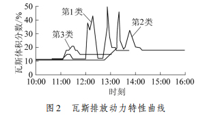 为分析割缝作业时孔内瓦斯动力特性,利用瓦斯探头测量各钻孔内瓦斯浓度演变特性,由实际观测可知其变化特征均相异,较为复杂。但就整体而言,可以按探头监测到的最大峰值将瓦斯排放现象分为以下3类(图2):
