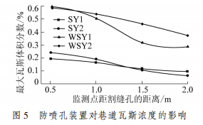 2)防喷孔装置应用效果分析。割缝作业时,选择 4个距离接近的割缝孔,其中,2个使用防喷孔装置,记作SY1、SY2;余下不使用,记作WSY1、WSY2测量距割缝孔不同位置处的瓦斯浓度变化,取观测段内瓦斯浓度最大值绘图(图5),由图5中可知,使用防喷孔装置后,周边巷道瓦斯浓度大幅受抑,基本控制在0.3%以下,未出现瓦斯超限现象。而未使用时瓦斯浓度较大,最高达0.61%。显然,该装置对巷道瓦斯抑制明显,可以保证现场施工的安全性。