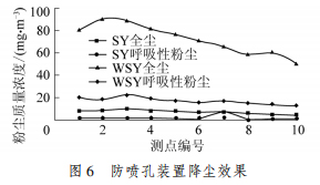 为考察该装置的降尘特性,采用CCHZ-1000全自动粉尘测定仪对距割缝孔不同距离处(测点布置间距为1m)的全尘及呼吸性粉尘浓度进行分析,并比较SY(使用防喷孔装置)与WSY(未使用防喷孔装置)2种情况下的测试结果,如图,6所示。