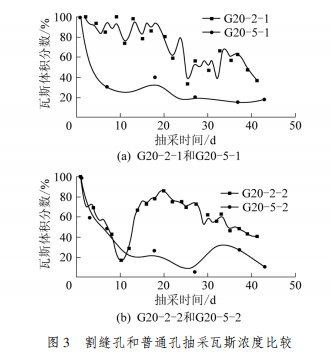 为了定量分析割缝孔与普通孔浓度的差异,计算了两者在统计时间内的平均浓度,图3a中G20-2-1与G20-5-1的瓦斯抽采体积分数分别为71.6%与30.3%,而图3b所对应值则分别是59.4%和32.1%。可见割缝孔所对应的瓦斯抽采平均浓度远大于普通孔。