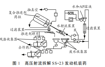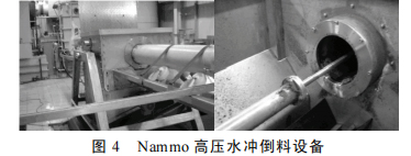 美国 Nammo 公司开发了一套高压水冲倒料系统,主要用于冲洗装有 APC 推进剂的火箭发动机。这套系统主要由 10 m3 容积水箱、水管、100 MPa的高压泵、发动机底座、过滤系统、炸药容器、排气装置、升降装置、控制系统等组成,其倒料能力为 150 kg/h。该系统使用旋转的夹具将火箭发动机夹紧,同时高压泵压出 100 MPa 的高压水也被传输