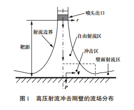 高压射流清理材料表面过程的流场按其流动特性 可分成 3 个区域:自由射流区、冲击区和壁面射流区, 如图 1 所示[5] 。 自由射流区内,射流受壁面的影响非 常小,因此可认为该区域的流动特性与自由射流相同。 在冲击区,射流急速改变方向,由轴向流动变为径向流 动并且存在极大的压力梯度。 该区域是引起壁面发生 弹塑性变形,甚至塑性去除、脆性去除或断裂的集中区 域。 壁面射流区的流动速度减弱,而且相对平稳,因此 一般不会发生壁面材料变形或去除[6] 。