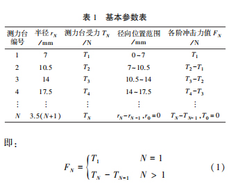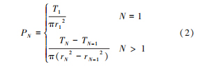 当N=1时,为第一圆盘冲击力值与测力圆盘面积的比 值;当 N>1 时,为该径向位置冲击力值与该位置环形 增量面积的比值,单位为 Pa,即: