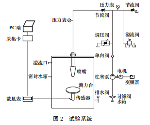 为研究高压水射流与高压磨料射流对刚壁冲击力的分布规律,设计了高压水射流测力系统,见图 2。