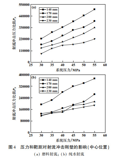 在靶距不变的情况下,无论纯水还是磨料射流,其冲击压力与系统压力呈正相关,不同的是,纯水射流在靶距140mm时,射流冲击压力明显大于其余3个靶距(170mm,200mm,230mm)的冲击压力,且后3个靶距的冲击压力相近;而对于磨料射流,其冲击压力随靶距增大,近似等速率降低,呈负相关变化。