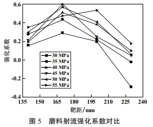 图5为不同系统工作压力下,不同靶距位置磨料射流强化系数的对比。