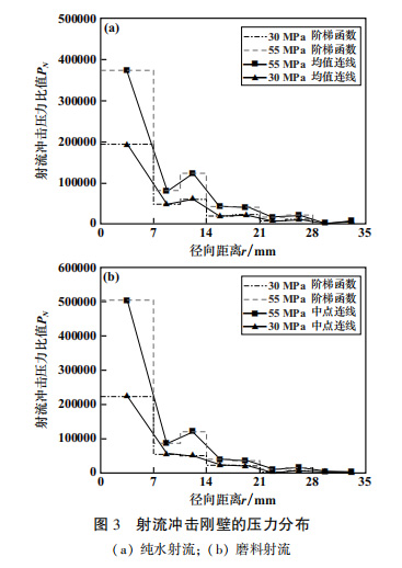 选定140mm 靶距,图3为试验获得的在不同系统压力下纯水射流和磨料射流冲击刚壁压力随径向距离的变化关系(多次试验的平均值)。 由图3可知,随径向距离增加,在1阶冲击力值(偏离中心位置7mm)后,冲击压力急速降低,是一非单调递减的阶梯函数,连接各阶中点位置,可视其为具非单调负指数下降规律(负指数函数和低幅谐波函数的叠加),而非切割小口径喷嘴射流形成的近似高斯分布规律。 压力急速下降的负指数关系是由于射流在冲击区沿径向改变方向后射流速度的耗散,导致非单调下降的低幅谐波变化尚待作进一步的理论和试验研究。系统压力增加,射流压力增加,呈正相关变化,但对射流压力的总体分布规律(分布形状)影响很小,与文献[5]的研究结果一致。 磨料射流除相应的冲击压力增加外,其分布规律基本与纯水射流一致。