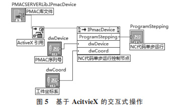 在 LabVIEW 开发环境下, 通过调用 Turbo PMAC的库文件, 采用 ActiveX 引用节点实时控制机床的单步、点动、中断等交互式运行操作如图 5 所示。