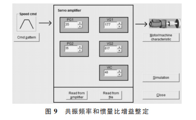 如图 9 所示,将驱动器置于速度控制模式,选择自动调整响应方式,同时通过试运行获取机械共振频率,根据机械共振频率预设响应速度,建立用于负载惯量比推算的增益表。
