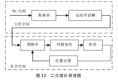 由于并联机构刀具在操作空间中的运动是关节空间伺服电机运动的非线性映射(虚实映射),首先根据精度要求及插补周期在操作空间中离散刀具轨迹,然后通过虚实变换将数据转化到关节空间, 再送入控制器进行精插补,进而驱动平台运动。 图 12 为二次插补原理图[4]。