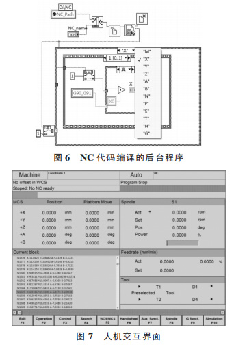 利用 LabVIEW 面向对象编程的灵活性,实现针对五轴加工代码语法检测、安全检测、离线仿真等作用,图 6 为 NC 代码编译的后台程序。 在 LabVIEW 开发环境下开发出如图 7 所示针对五轴加工的数控系统人机交互界面,实时采集电机的运动信息,监控电机运行,从而构建运动控制需要的软件平台。