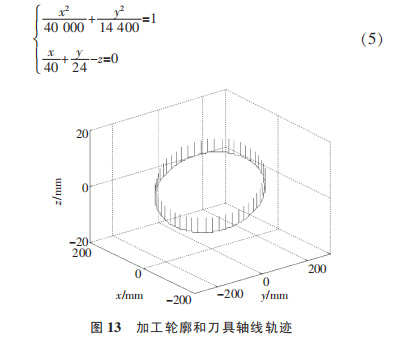 为验证伺服电机控制参数调节的有效性和轨迹控制的精度, 需要设计五轴加工轨迹代码实时采集电机的跟随误差和加速度, 用加速度检验电机控制参数有效性,用跟随误差度量轨迹控制精度。给定如图 13 所示控制点的刀具加工轨迹,加工轮廓为式(5)表示的空间椭圆曲线轨迹,刀具轴线矢量与椭圆曲线所在平面的法向量成固定角度。