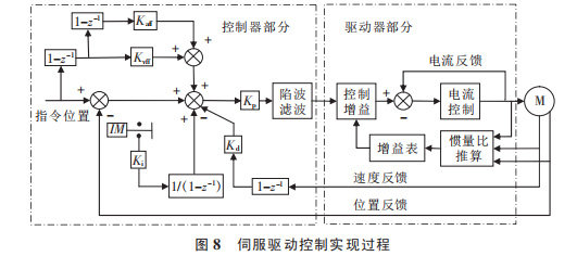 文中所述五轴联动机床采用美国 DELTA TAO 公司的 Turbo PAMC PCI型控制器和日本三菱公司的MR-J2S-A 型驱动器。图 8 所示为五轴联动机床伺服电机的 PID 控制实现过程,Turbo PMAC 控制器中的伺服算法采用 PID+速度/加速度前馈+陷波滤波的控制算法,驱动器负责接收模拟量速度指令,根据实时负载变化进行增益控制调整电流环的力矩输出指令。 该过程的实现需要进行驱动器参数配置、控制器 PID 参数整定、控制器前馈参数整定 3 个步骤。