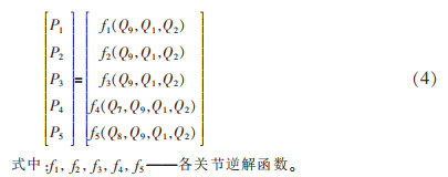 并联机构的关节空间伺服驱动电机的运动是末端执行器工作空间运动的非线性映射,Turbo PMAC 提供了嵌入式运动学机制,实现复杂的非线性运动学运算。5 个电机的驱动位移分别对应 Turbo PMAC 的全局变量 P1,P2,P3,P4,P5, 工作空间改为工作空间 x,y,z,α,β位置坐标对应 Turbo PMAC 的坐标变量 Q7,Q8,Q9,Q1,Q2。根据文中机构运动学逆解分析,嵌入式运动学逆解可表示为:
