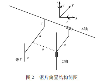 图 2 中,A 轴轴线与 C 轴轴线在 Y 方向上的偏置为 a; 锯片转动轴线与 C 轴在 X 方向上的偏置为 b,与轴在 Z 方向的偏置为 c; 锯片中心与 A 轴在 Y 方向的偏置为 d; 锯片半径为 e。