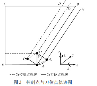 同理,通过偏置补偿公式( 1,2) 可以把 C 轴旋转后的控制点轨迹 O1D1 修正到 OD,以使刀位轨迹与 AB重合,实现正确加工。