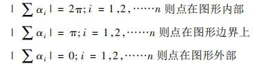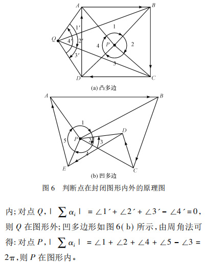 给定 3 点 P( xp,yp ) 、A( x1,y1 ) 、B( x2,y2 ) ,判断点P 相对于 AB 走向所成夹角正、负的判别式[4]为:f( x,y) = ( xp - x1 ) ( y2 - y1 ) - ( yp - y1 ) ( x2 - x1 ) ( 4)凸多边形如图 6( a) 所示,由周角法[7-8]可得: 对点P,| ∑αi | = ∠1 + ∠2 + ∠3 + ∠4 =2π,则 P 在图形