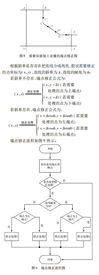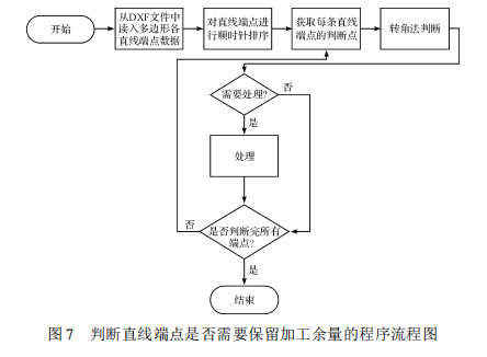 以图 5( b) 所示直线 BC 为例,由上述算法可得端点 C 需要保留切割余量,而端点 B 则不需要。判断直线端点是否需要保留加工余量的程序流程图如图 7 所示。