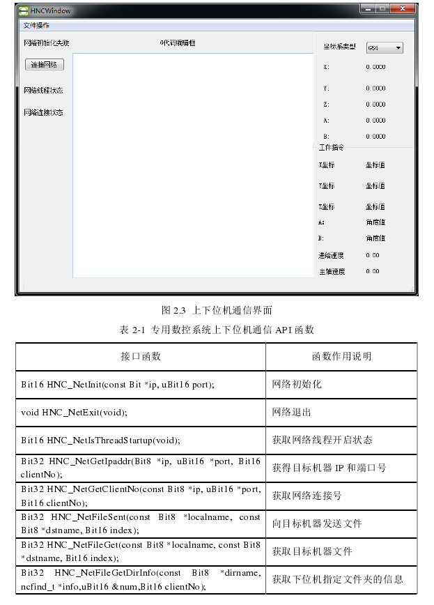 本文研究的 CAD/CAM 一体化的五轴联动水刀切割专用数控是上下位机的系统构成,上位机是在 Windows 平台上利用 Qt Creator 开发的 CAD/CAM 一体化软件,下位机是华中 8 型数控系统。针对五轴水刀切割特殊加工工艺和控制要求开发了专用数控系统。其中上位机与下位机的通信主要是通过华中 8 型数控系统提供了一个以太网口(通过网线连接)进行网络连接来获取下位机信息,及将上位机有关信息传送到下位机,如将上位机软件生成的五轴数控 G 代码发送给下位机。拟开发的 CAD/CAM 一体的五轴联动水刀切割专用数控系统上下位机通信的界面如图 2.3 所示,专用数控系统二次开发通信的 API(Application Programming Interface)函数主要如表 2-1 所示。CAD/CAM 一体化上位机可以利用华中 8 型二次开发接口函数与华中 8 型数控系统下位机建立连接,并进行数据之间的交换。