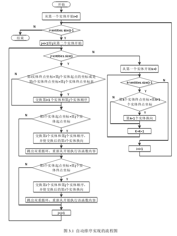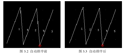 图形实体在创建时是以一定的方式被放到实体容器中的,比如按先创建先放的顺序。但往往在加工由多个实体组成的某一轮廓轨迹工件时,要按照最短路径的方式或是简便的方式走完整个轮廓,使工作时间最短,效率最高。自动排序就是按照这种加工路径最短的方式实现的。当实体数量较多,而且顺序杂乱无章时,用户要花很长时间,且要经过多次操作来实现一定的顺序,所以自动排序的方式也方便了用户的操作。图形元素自动排序的实现也就是对链表(RS_Entity  *entities)中实体指针进行重排,根据零件轮廓线上前、后图形实体邻接的原则,确定了加工方向和下一个邻接实体,然后建立一个临时的实体指针 RS_Entity  *temple 用于交换链表 entities 中两个实体指针的位置,交换后的实体指针存储到链表 entities 中。自动排序实现的具体流程图如图 3.1 所示。自动排序实现前后的效果图分别如图 3.2 和图 3.3 所示。排序前,创建实体的顺序为 1-4-2-5-3,自动排序后的顺序为
