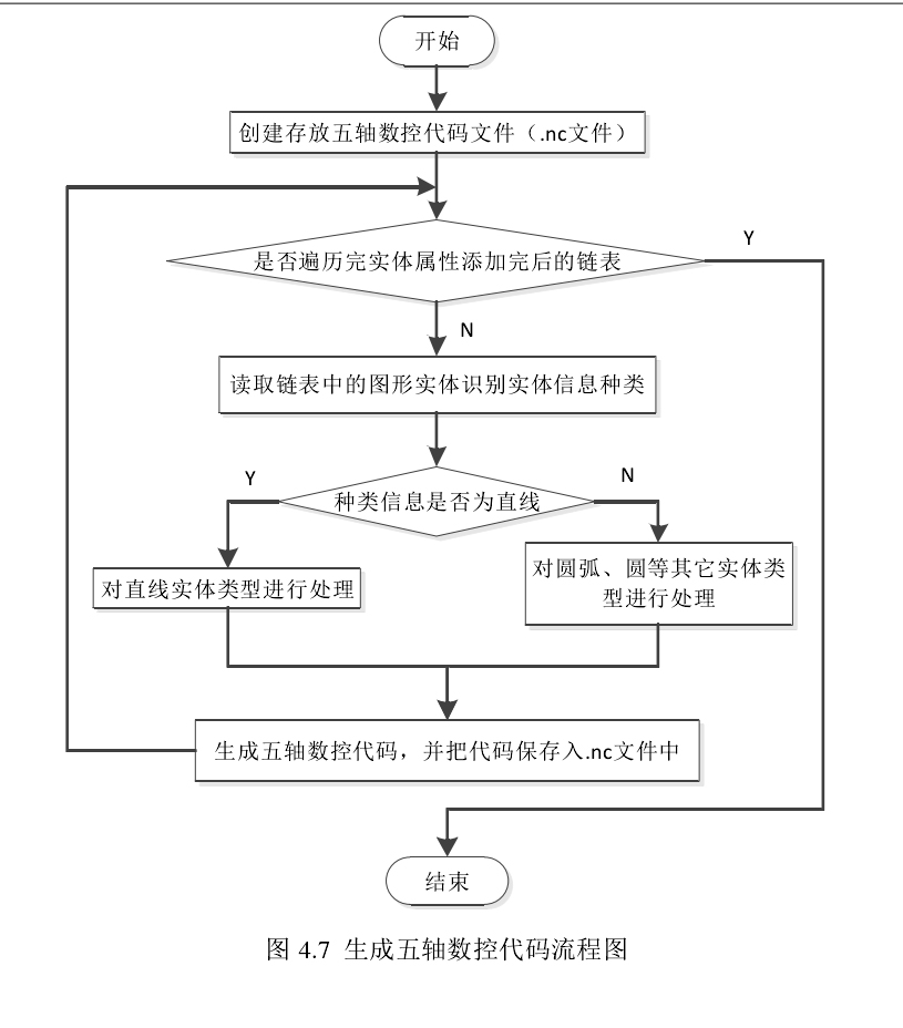 RS_Arc”等,然后再具体到针对特定实体类型信息进行处理,生成五轴数控加工 代码,保存到.nc 文件中。五轴数控代码自动生成的流程图如图 4.7 所示。